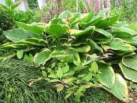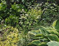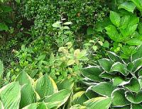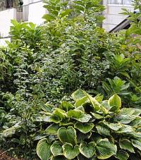 手前は大きな葉のホスタで、後方には実生のガクアジサイがあります。