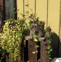 この秋に購入し、ポットのままで味噌樽を鉢カバーにしている斑入りハニーサックル。