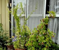 斑入りハニーサックルのほうのプランターは目立った変化はありませんが、お隣ではボイスンベリーの赤や黒の実がなっています。