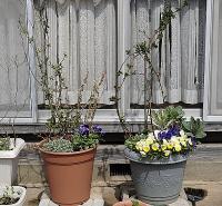 お隣の枝はボイスンベリーで、種をまいて育てたパンジー「よく咲くすみれ」とやはり何代も種をまいて育てているハボタンやセダム「パリダム」やワスレナグサが入っています。