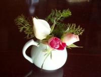 ミルクカップに入れただけのバラとフェンネルのアレンジメント