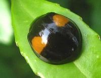 見た目はテントウムシにそっくりなヘリグロテントウノミハムシ。