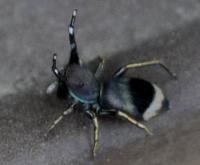 このハエトリグモの名の由来はこの青帯からついたのでしょうか・・・