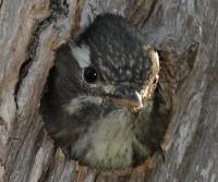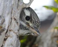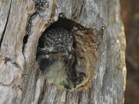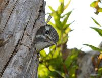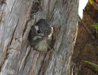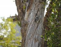 コゲラの巣があるという話を聞いて行ってみるとコゲラの雛が顔を出しています。巣穴の高さは大人の顔のあたりなので、普通に立っていてよく見える位置です。