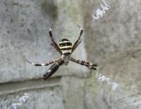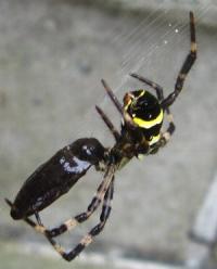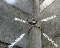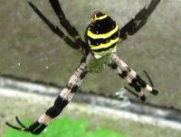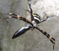 大型のクモの上、鮮やかな黒と黄色の縞模様なのでよく目立ちます。