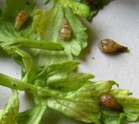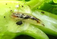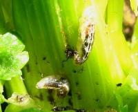 アブラムシで汚くなったプランターのセロリにいた、ヒラタアブの幼虫。