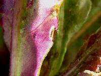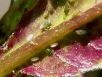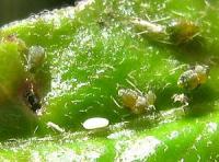 キンジソウの葉の表側。アブラムシとヒラタアブの卵が一つ。