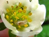 上のヒラタアブの幼虫を、アブラムシがたくさんいるイチゴの花に置いて、次の日に見たらもう花にはアブラムシもヒラタアブの幼虫もいませんでした。