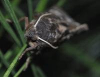 ピンボケですが、前から撮したマツカレハの成虫です。