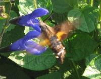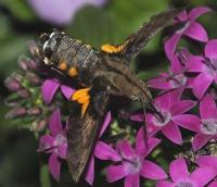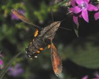 ホシホウジャク成虫は夜行性ではなく、日中にも飛び回ってホバリングしながら長い口を伸ばして吸蜜します。