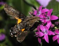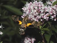 ホシホウジャク成虫は茶色で後翅の黄色が目立つスズメガの仲間。