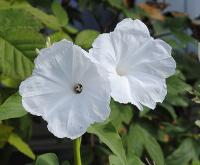 プランターに植えてある白いキダチアサガオ(コダチアサガオ)の花が咲きました。