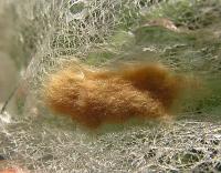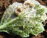 ケールに産み付けられたハスモンヨトウの卵嚢。ハスモンヨトウはとにかくケールが大好物なようで、ケールに不織布を被せてもその上からどんどん卵を産み付けます。