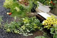 反対側から撮ったところです。軒下にずらりと並べたミニトマトや草花類、多肉類でどうしようもないほど散らかっています。