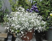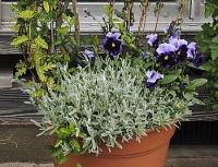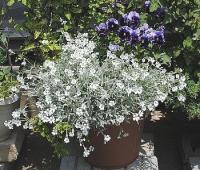 一株でもかなりのボリュームのセラスチュームです。後方のフリル咲きパンジー・ムーランフリルが負けじと背伸びしているようです。