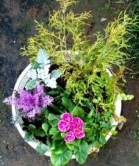 プリムラ・ポリアンサ、コニファー、ハボタン、シロタエギクなどと。