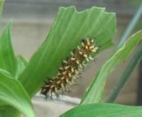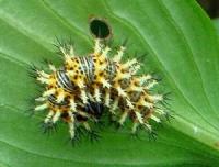 ホトトギスの葉の裏にいたルリタテハの幼虫。イラガのようにトゲが体中にあり、触ると痛い感じがするが、そうでもないらしい。