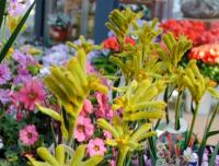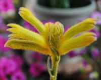 店頭で見かけたカンガルーポーという珍しい花(黄色の花)です。