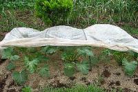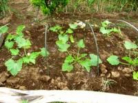 ウリハムシから守るために不織布を掛けてあります。芝の葉で薄くマルチングしました。