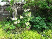 カシワバアジサイの鉢植えは右側にあるジューンベリーの木の下に置いてあり、まわりにはクチナシ、ブルーベリー、下側にはルメックス、フウチソウ(風知草)があります。