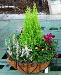 ゴールドクレスト、カルーナ、パンジー・ビオラ、キンギョソウの寄せ植えです。