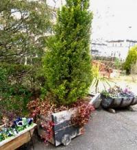 他所のゴールドクレストとハツユキカズラの寄せ植えです。多分植えた当初は草花が入っていたのでしょう。