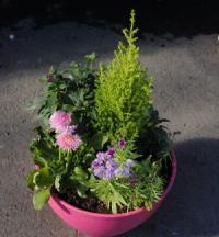 上と同じプランターです。ゴールドクレストとハツユキカズラを残し、イソギク、ハナイソギク、ゼラニウム、ニューサイランを足しました。