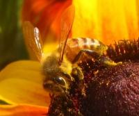 ルドベキアの花の上で花粉まみれのセイヨウミツバチ。