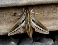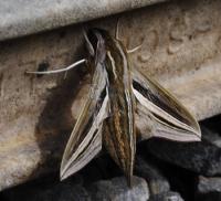 はっきりした幅広の黒と白い帯模様が翅に入ったセスジスズメ。