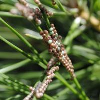 マツカレハの卵には水色と茶褐色の粒がありました。