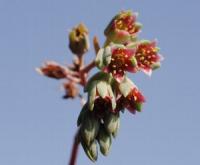 春、星美人は花茎を長く伸ばし、先端に十輪ほどの鮮やかな紅色の花を下向きに咲かせます。