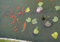 スイレンのまわりを金魚と錦鯉が気持よさげに泳いでいます。季節は夏ではなく秋ですが・・・