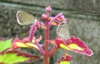 まだ花が咲いていないのにコリウスにチョウが止まっている。赤い葉を花と間違えているのかな?