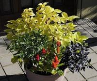 コリウス「レッドアイズ」、観賞用とうがらし2種、羽毛ケイトウ