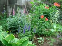 赤い花はアルスオロメリア、その奥に数種ある(斑入り葉が見える)のは宿根フロックスで、ブルーの花が