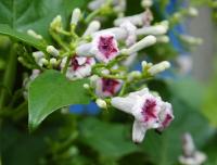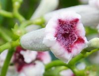 中心部分は紅紫色をしていて、花弁が白色のヘクソカズラの花。
