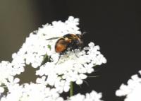 このハナアブを撮ったのは初めてです。紋様に特徴があるので、名前がすぐにマルボシヒラタハナアブとわかりました。