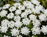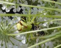 ホワイトレースフラワーの裏側ではハナグモにハナアブらしきものが捕らえられていた。