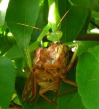 庭のヒメシャラの木でセミを捕まえて食事中のオオカマキリ。