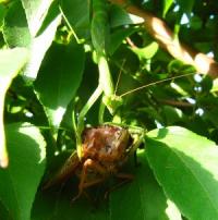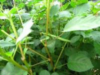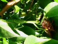 こちらはオンブバッタに食害されたモロヘイヤが穴だらけ・・我が家の菜園にはオンブバッタが昨年あたりからかなり増えています。