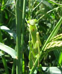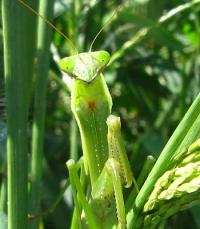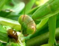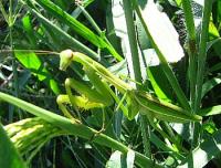 迫力のオオカマキリのアップ。よく見るとコワイですが、菜園では害虫などを退治してくれる大きな助っ人です。もっとも益虫、害虫の区別なく目の前の動く虫を捕まえるらしいのですが・・・虫を目の前に置いても、その虫が動き出さないと捕まえないのですよ。