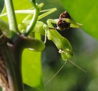 グリーンカーテンのアサガオにいたカマキリがカメムシを食べているところです。