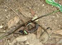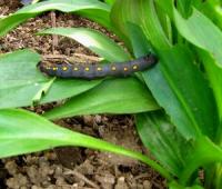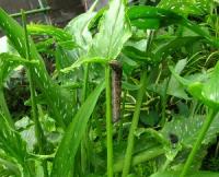毎日のように捕殺。捕っても捕ってもどこからともなく現れてこのように食べているので、油断するとカラーの葉が全滅になってしまう。