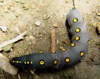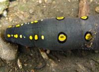 カラー(サトイモ科)の葉を食べているセスジスズメの(幼虫)
