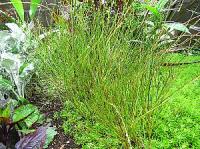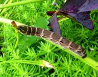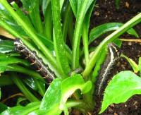 カラーの葉を全部食べつくし、茎までかじっているセスジスズメ(幼虫)