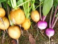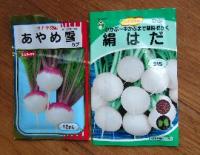 2009年春は「あやめ雪」もまいてみました。いつものコカブより少し大きめで色合いが赤みがかった薄い赤紫と白がきれいな小カブです。