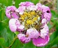 朝、畑に行くと開花したばかりのシャクヤクの花がもうこんな風になっています。