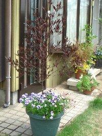 パンジー、ビオラ、ドドナイア・ポップブッシュ(木)の寄せ植え 4/12