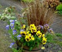 パンジー、ビオラ、ブラウングラス・ブキャナリー、アメリカイワナンテンとの寄せ植え
