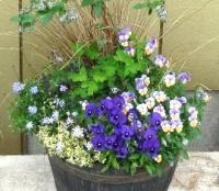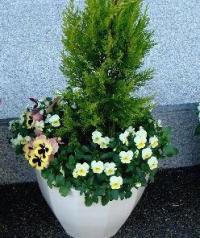 コニファーを入れたパンジー・ビオラの寄せ植え